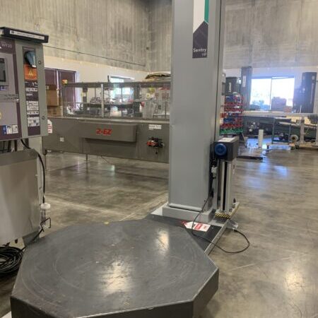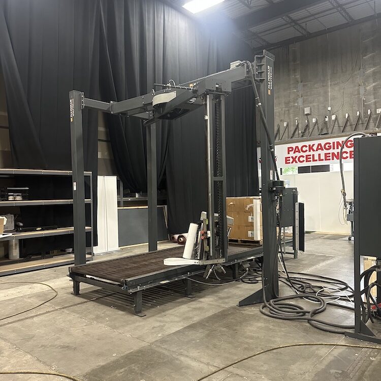 Semi-auto 3 post overhead rotary arm stretch wrapper with Allen-Bradley panel view 300 micro touchscreen.