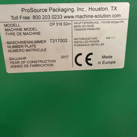 • Seal bar: 16″W x 20″L, hot wire, magnetic hold down.